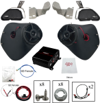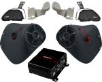 98-13 Road Glide package. Includes SinisterSound Bass Reflex fairing speaker system with enclosures, grills and mounting hardware. SounDigital XP 400.4 amplifier, power and ground harness, RCA splitter cables, remote turn on wire.